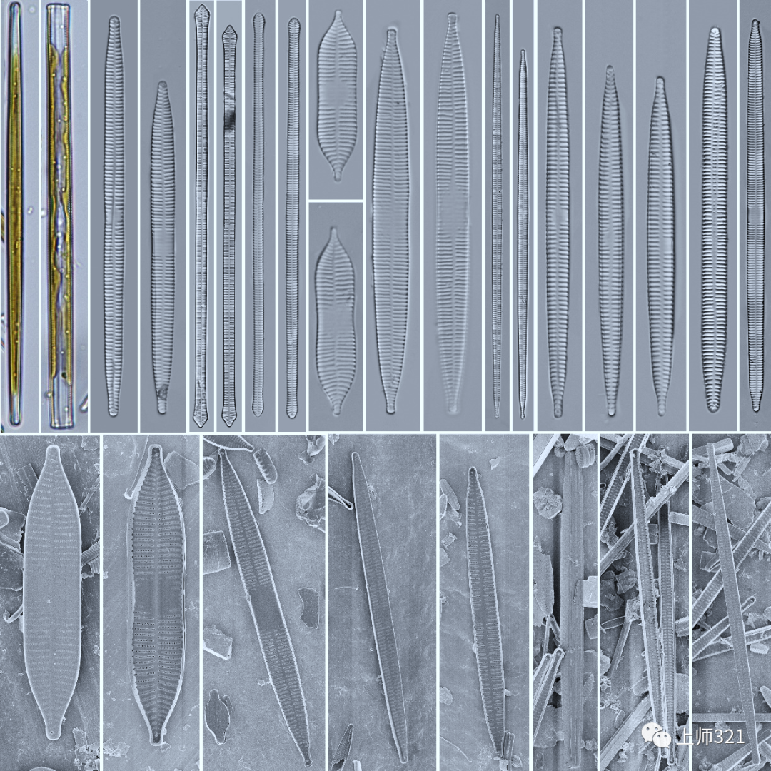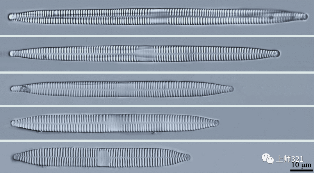 光鏡(LM)描述:殼面細長,線形至披針形,兩側平行,末端圓形至喙狀。中軸區明顯,線形。中央區在少數標本中不明顯,但在大部分標本中,呈矩形。殼面長65-134 μm,寬6.5-11 μm。線紋單列,平行排列,末端微輻射排列,每10 μm內有9-11條。環帶閉合,一般不超過四條。