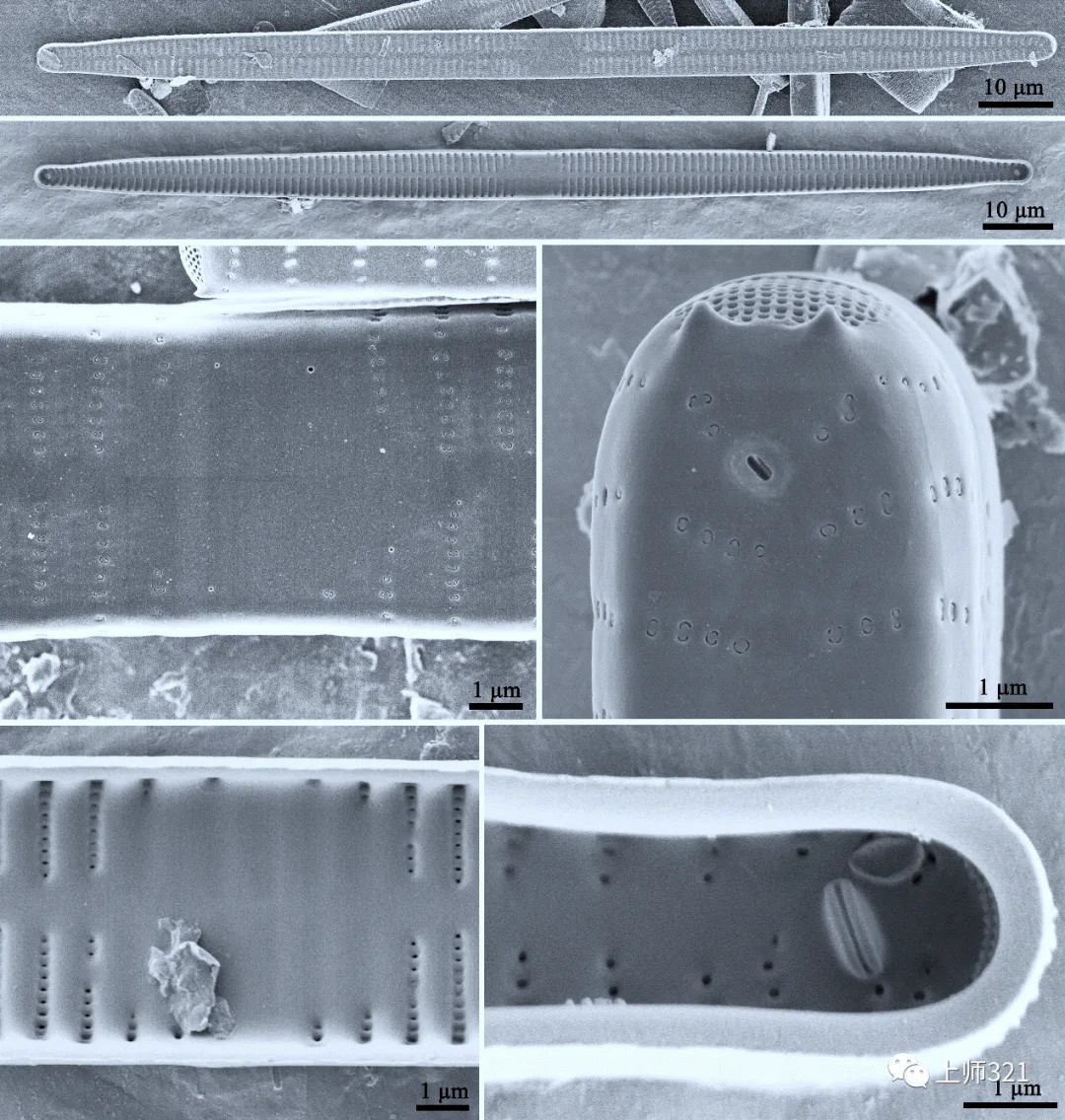 掃描電鏡(SEM)描述:線紋單列,由圓形至橢圓形的孔紋組成,孔紋被硅質小片覆蓋。殼面兩端各具一個唇形突,從外殼面看是一個簡單的孔,從內殼面看是一個由兩個硅質片狀結構組成的唇形狀突起。頂孔區兩個,位于殼面末端殼套上,由規則排列的孔紋組成。從外殼面看,殼面最末端通常具兩個堅硬的硅質小刺。